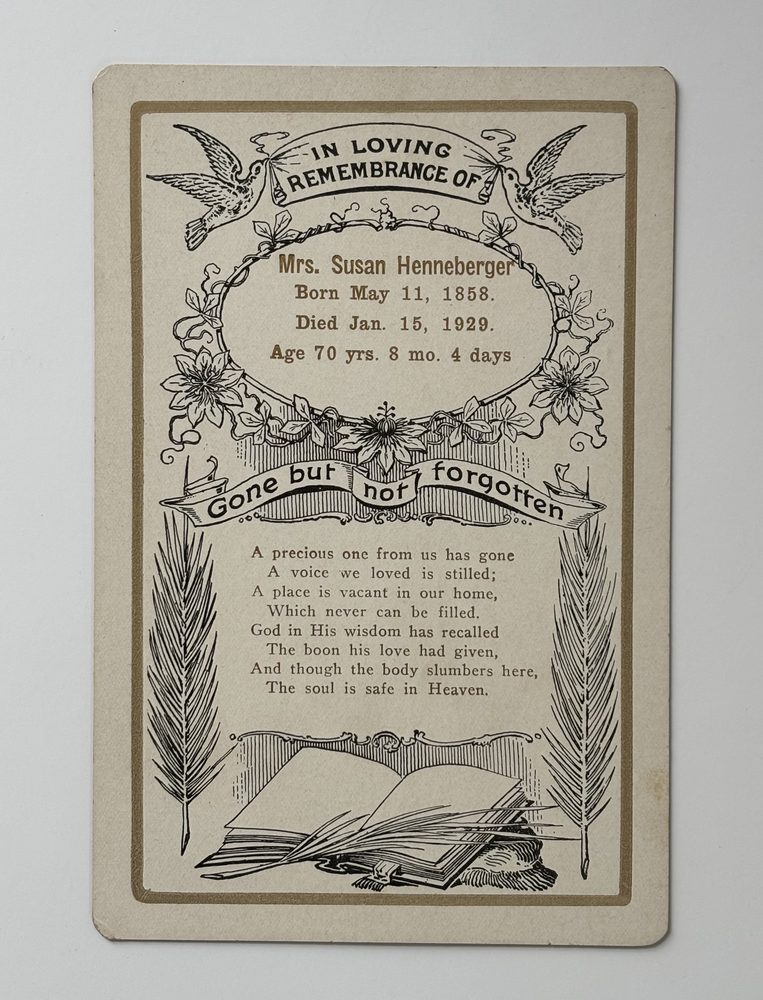 Memorial card commemorating the death of Mrs. Susan Henneberger who died on January 15th, 1929 at the age of 70 year, 8 months, and 4 days.